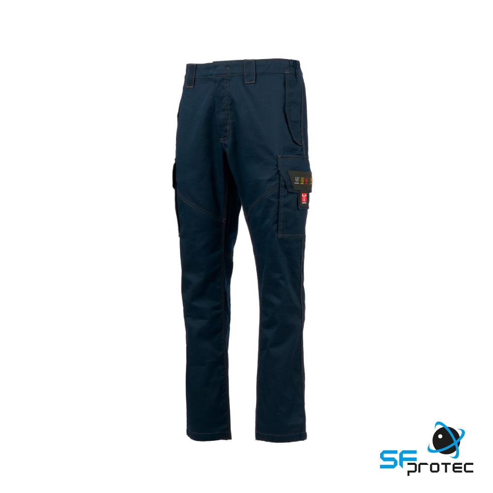 - Calças em tecido antiestático, ignífugo, com propriedades de resistência ao arco elétrico e aos agentes químicos, ideais para soldadores.